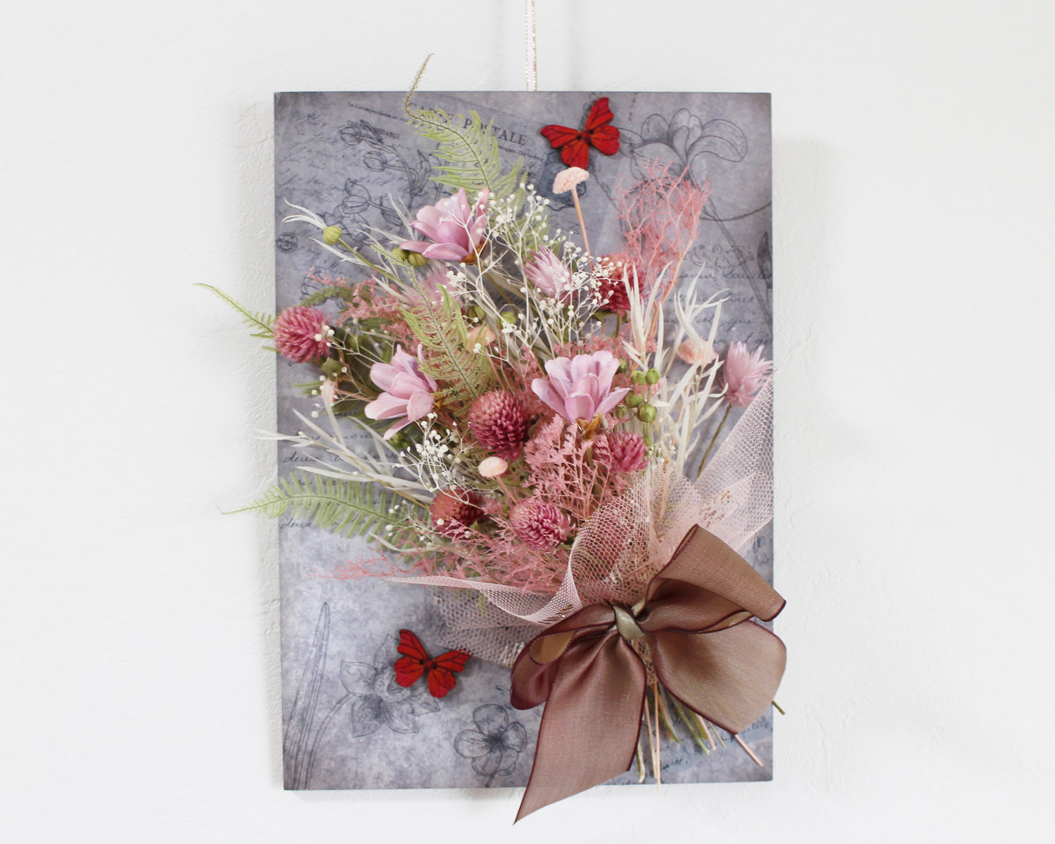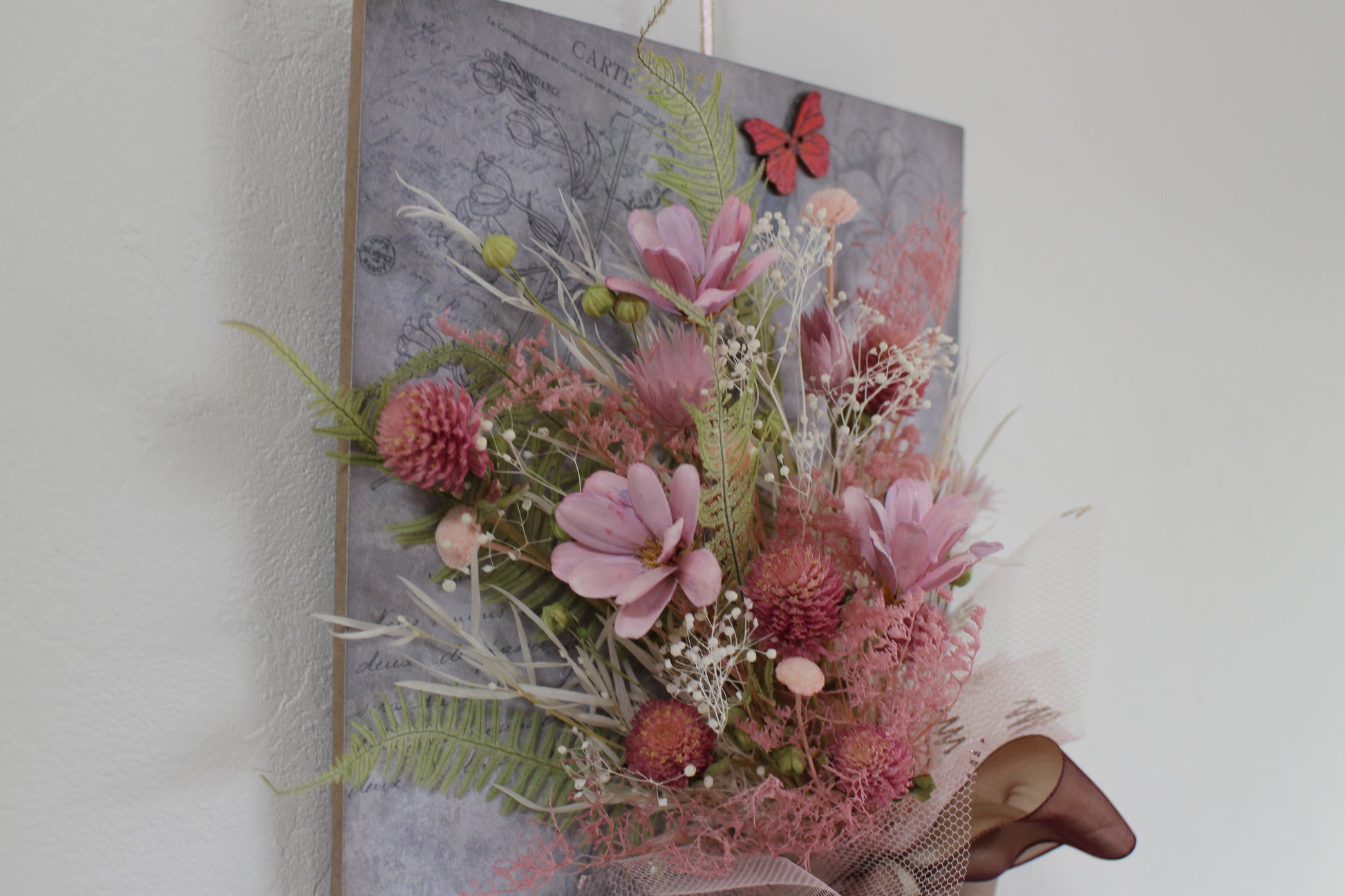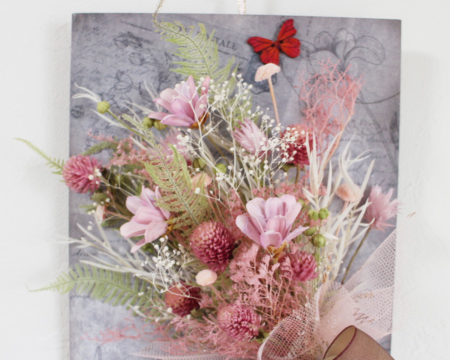 使用花材・・・センニチコウ、ミニカスミソウ、ボタンフラワー、ソラフラワー、シルバーティーツリー、ヤマシダetc...